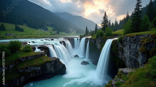 © Collse, Fototapeta premium A professional photo of Reichenbach Falls in Switzerland at dawn, cloudy conditions, shot from above, showcasing the dramatic fall amidst the moody sky.