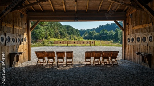© Nuttaya Nampai, Fototapeta premium A professional shooting range with several targets set up at different distances, prepared for a day of firearms training and target practice