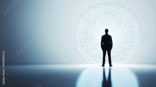 Obraz premium A professional standing in a ring of language symbols, glowing against a clean white backdrop