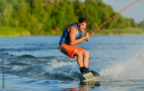 © Mark_studio, Fototapeta premium A professional wakeboarder rides on the lake in sunny weather, performing figures