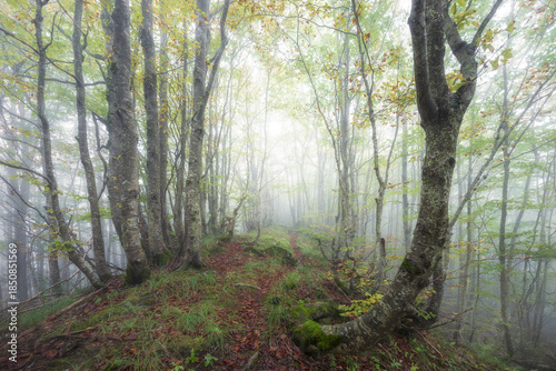Fototapeta premium A professional wide-angle landscape photograph of a misty beech forest....