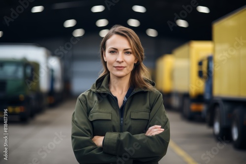 Fototapeta premium A Professional Woman Commands the Scene at a Dynamic Truck Loading Dock