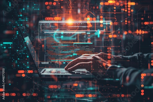 © SUPHANSA, Obraz premium A programmer coding on a laptop, surrounded by lines of code and digital interfaces, showcasing technology expertise