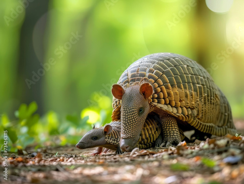 Obraz premium A protective armadillo mother with her curious baby in a summer meadow.
