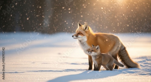 © David, Obraz premium A protective vixen and her small kit watch attentively in a serene, snow-covered field as snowflakes fall around them, backlit by beautiful golden hour sunlight