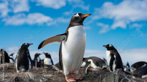 © Ridwan, Obraz premium A proud gentoo penguin stands tall with one wing slightly raised in a colony under a bright blue sky with scattered white clouds