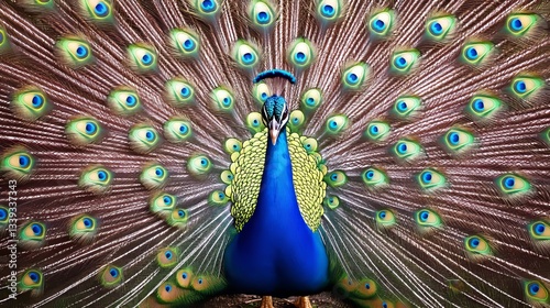 Obraz premium A proud peacock with iridescent feathers fanned out, creating a stunning display.