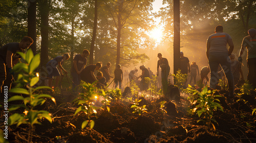 Fototapeta premium A public garbage collection event at dawn in a dense forest