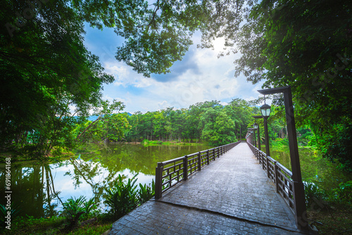 © Thinapob, Fototapeta premium a public place leisure travel landscape the wooden bridge lake views at Ang Kaew Chiang Mai University and Doi Suthep nature forest Mountain views spring cloudy sky background with white cloud.