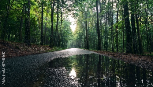 © Matteo, Obraz premium a puddle on the road through the dark deciduous forest of the temperate zone