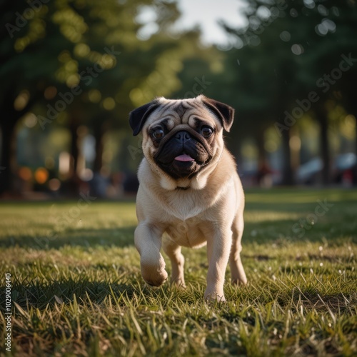 © azi, Obraz premium A pug dog walks towards the camera with its tongue sticking out. It is a sunny day with green grass and trees in the background.