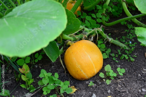 © Irina, Obraz premium a pumpkin is on the ground with a green leaf in the foreground