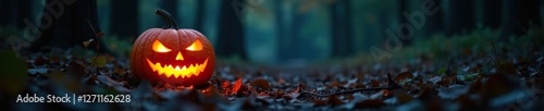 © Pusit, Fototapeta premium A pumpkin lantern glows with an otherworldly light amidst the forest foliage, pumpkin, dark