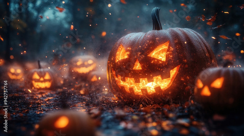 © Wararat, Fototapeta premium A pumpkin patch under a starry sky, with jack-o'-lanterns of various sizes and designs glowing eerily in the night.