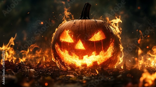 Naklejka premium A pumpkin with a scary face is lit on fire. The pumpkin is surrounded by fire...