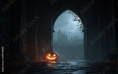 © Sergey Fedchenko, Fototapeta premium A pumpkin with a smiley face is sitting on the ground in front of a castle