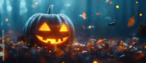 © Synthetica, Fototapeta premium A pumpkin with a smiley face on it is sitting on a pile of leaves. The leaves are orange and scattered around the pumpkin. Scene is festive and playful, as the pumpkin is decorated with a smiley face