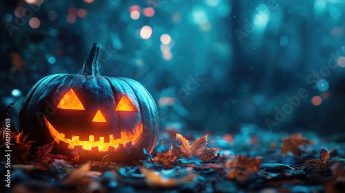 © Synthetica, Naklejka premium A pumpkin with a smiley face on it is sitting on the ground in a forest