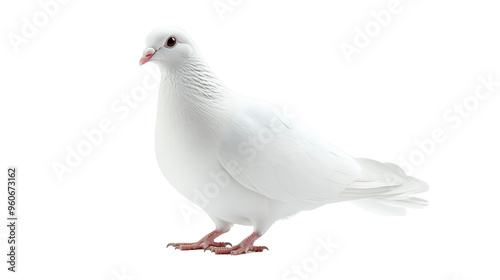 © Nano Photos, Fototapeta premium A pure white dove stands gracefully against a stark white background, symbolizing peace and serenity in its elegant and calm demeanor.