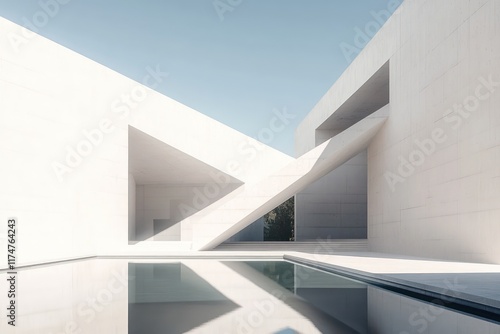 © KPMusa, Fototapeta premium A pure white geometric building with shadow-casting overhangs and a reflecting pool