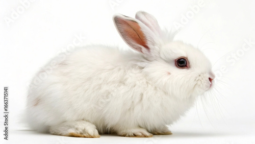 © Faizan, Obraz premium A pure white rabbit with reddish-brown eyes, sitting in profile against a seamless white background