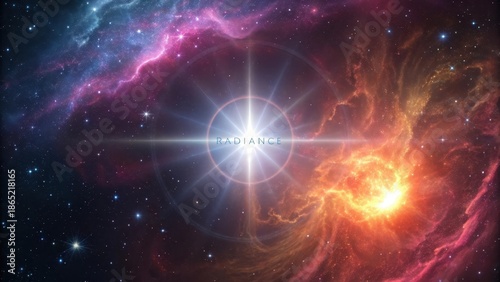 © Syazana, Fototapeta premium A pure white star emitting intense light and radiating outwards into a vibrant, multi-colored nebula in deep space