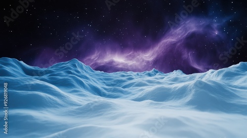 © starush, Naklejka premium A purple and blue light is shining over a snowy landscape, AI