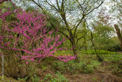 © kinovo, Fototapeta premium A purple bush is in the foreground of a field. The bush is surrounded by grass and trees