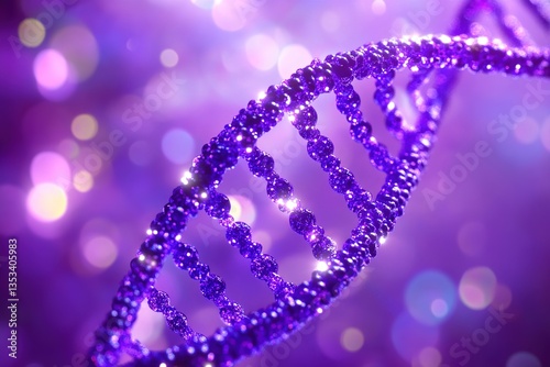 Obraz premium A purple DNA double helix molecule, blurred purple glowing background with bokeh light effects, soft lighting, technological and dreamy atmosphere