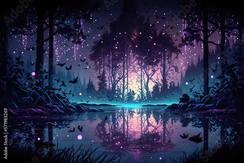 Fototapeta premium A purple fantasy forest with a reflective pond, magical trees, and a sparkling sky, generative ai