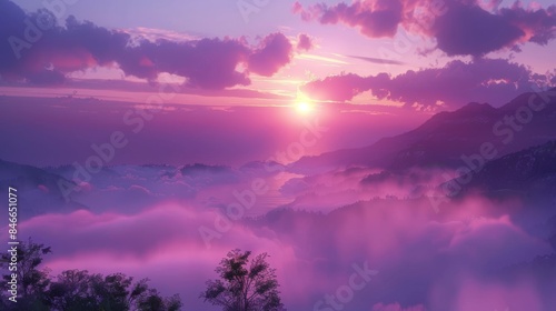 Fototapeta premium a purple sunset over a foggy misty forest valley