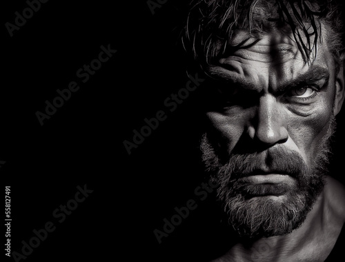 © Boris Znaev, Obraz premium A purposeful man, with a determined look. Black and white portrait, dramatic rim light. Black background. Free copy space. Created with Generative AI technology.