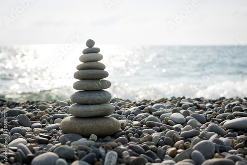 Fototapeta premium a pyramid of stones on a pebble beach against the sea and sky.