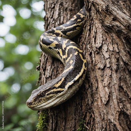 Fototapeta premium A python wrapping around a tree trunk with a white background.