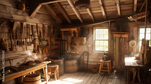 Obraz premium A quaint beekeeping shack, filled with traditional tools, is naturally lit,...