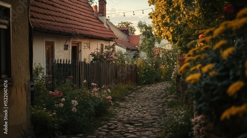 © lestari, Fototapeta premium A quaint cobblestone path winds through a charming flower lined village