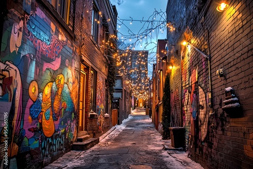 © ckybe, Fototapeta premium A quaint, cobblestone pathway adorned with colorful murals and twinkling lights beckons for evening wanderings in a delightful urban setting.