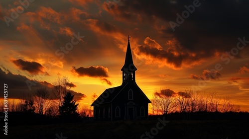 Obraz premium A quaint countryside church silhouetted against the warm glow of sunset, its...