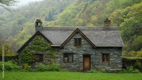 Obraz premium A quaint stone cottage surrounded by lush greenery in a misty landscape.
