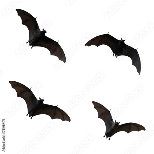© Natsumae, Naklejka premium A quartet of bats soars silently across a muted teal sky, wings outstretched in graceful flight, eerie.
