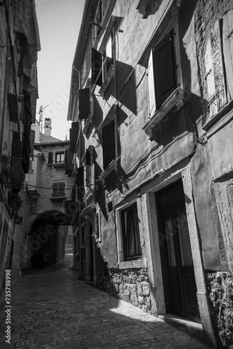 © dragoncello, Fototapeta premium A quiet back street in the historic centre of the medieval coastal town of Rovinj in Istria, Croatia