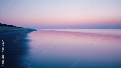 Fototapeta premium A quiet beach scene at twilight, soft pinks and blues reflecting in the calm...
