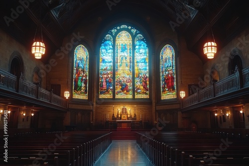 Obraz premium A quiet church interior featuring a stunning stained glass window and dimly...