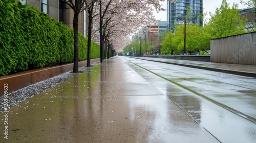 © Sergey, Obraz premium A quiet city street on a fresh spring morning, lined with blossoming trees.