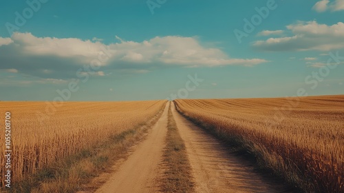 Fototapeta premium A quiet dirt road in the middle of an open field, stretching for miles with no sign of human presence