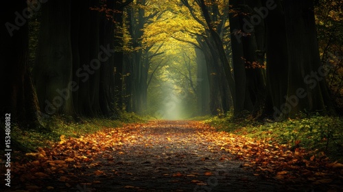 Fototapeta premium A quiet empty forest path covered in fallen leaves, winding between tall...