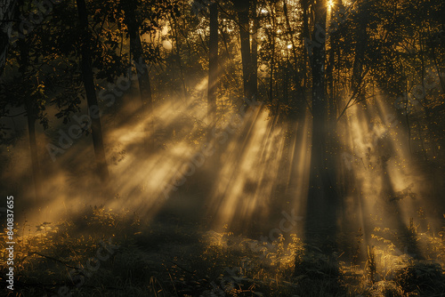 © Saeed, Fototapeta premium A quiet forest at sunrise, with the mist drifting lazily from the ground and sunlight filtering softly through the branches.