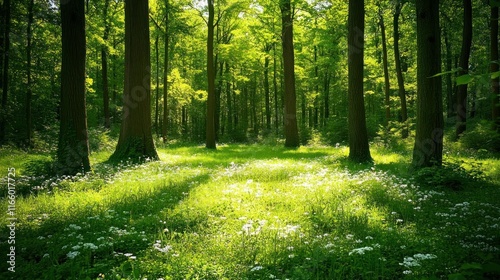 Obraz premium A quiet forest bathed in sunlight, surrounded by tall trees with green...