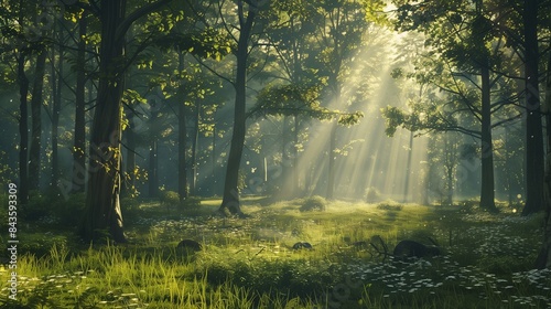 Fototapeta premium A quiet forest glade with sunlight streaming through the trees, indicating calm.