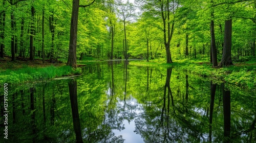 Obraz premium A quiet forest lake with lush green trees reflecting on the water, creating a...